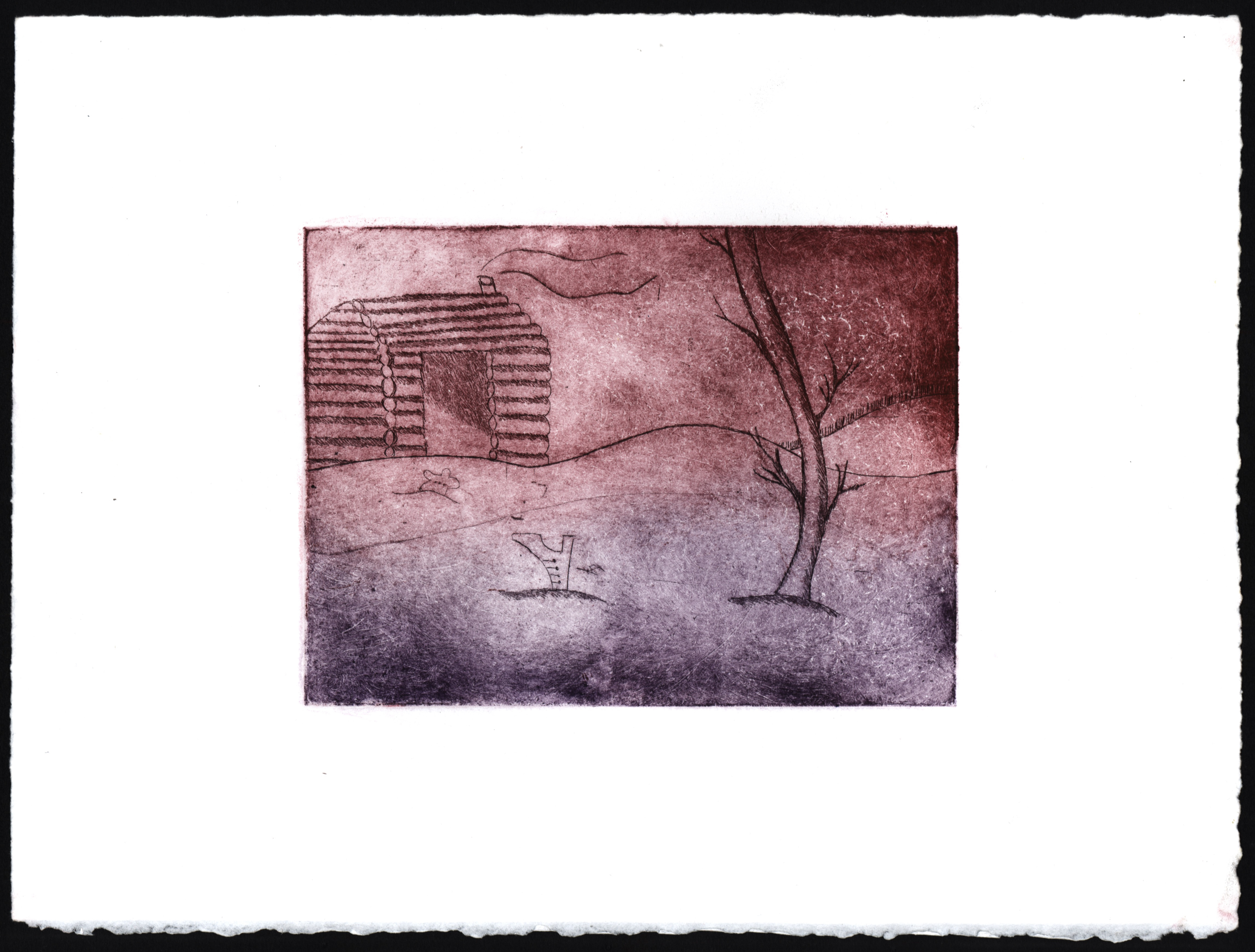 Keseberg’s Cabin #2, intaglio with Chine-colle, 15×11”, 2018